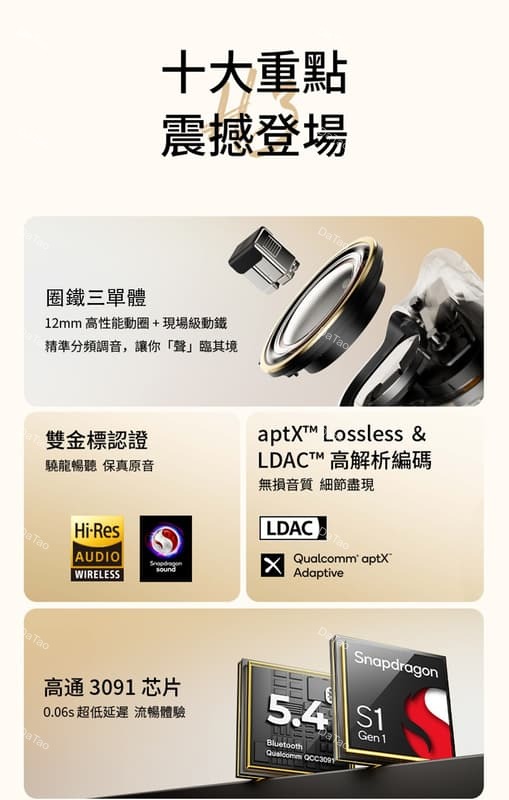 * 旗艦級三驅動單體配置:12mm 動圈 + 雙平衡電樞